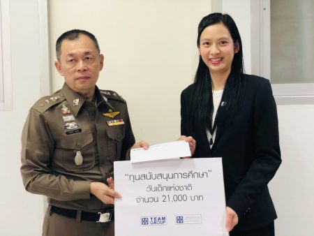 นางสาวมยุรี ก้วยเจริญพานิชก์ ผู้อำนวยการ-ทรัพยากรมนุษย์ ทีมกรุ๊ป มอบเงินสนับสนุนทุนการศึกษาแก่เด็กและเยาวชนบุตรหลานข้าราชการตำรวจ สถานีตำรวจนครบาลโคกคราม เป็นจำนวนเงิน 21,000 บาท