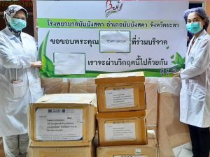 ทีมกรุ๊ป ร่วมกับมูลนิธิกลุ่มทีมรวมใจ นำโดย ดร.ประเสริฐ ภัทรมัย (ที่4จากซ้าย) ผู้ก่อตั้งและกรรมการอาวุโส ประธานกรรมการมูลนิธิกลุ่มทีมรวมใจ ดร.อภิชาติ สระมูล (ที่3จากขวา) ประธานเจ้าหน้าที่บริหาร ทีมกรุ๊ป พร้อมทีมผู้บริหาร บริษัท ทีม คอนซัลติ้ง เอนจิเนียริ่ง แอนด์ แมเนจเมนท์ จำกัด (มหาชน) หรือ TEAMG มอบชุด PPE จำนวน 400 ชุด หน้ากาก N95 จำนวน 1,100 ชิ้น หน้ากากอนามัย Surgical masks จำนวน 600 ชิ้น และ Face shield จำนวน 250 ชุด ให้กับ สถาบันบำราศนราดูร โรงพยาบาลสวรรค์ประชารักษ์ จ.นครสวรรค์ และโรงพยาบาลบันนังสตา จ.ยะลา เพื่อสนับสนุนการทำงานของบุคลากรทางการแพทย์ ในการป้องกันและลดการแพร่ระบาดของโรคติดเชื้อไวรัส COVID-19 ภายใต้โครงการ “ทีมกรุ๊ปร่วมใจต้านวิกฤตไวรัส COVID- 19 ”เพื่อใช้ป้องกันและลดการแพร่ระบาดของโรคติดเชื้อไวรัส COVID- 19