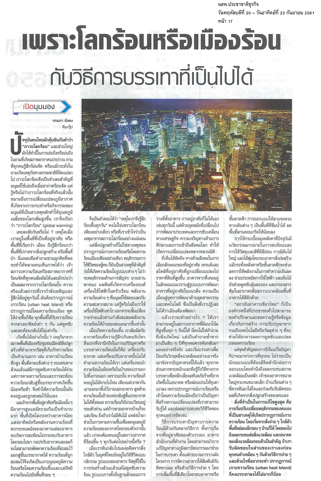 อ่าน “เพราะโลกร้อนหรือเมืองร้อนกับวิธีการบรรเทาที่เป็นไปได้” โดย คุณกรนภา ยังคง ทีมกรุ๊ป ตีพิมพ์ในนสพ.ประชาชาติธุรกิจ ฉบับวันที่ 20 – 23 กันยายน 2561 หน้า 17