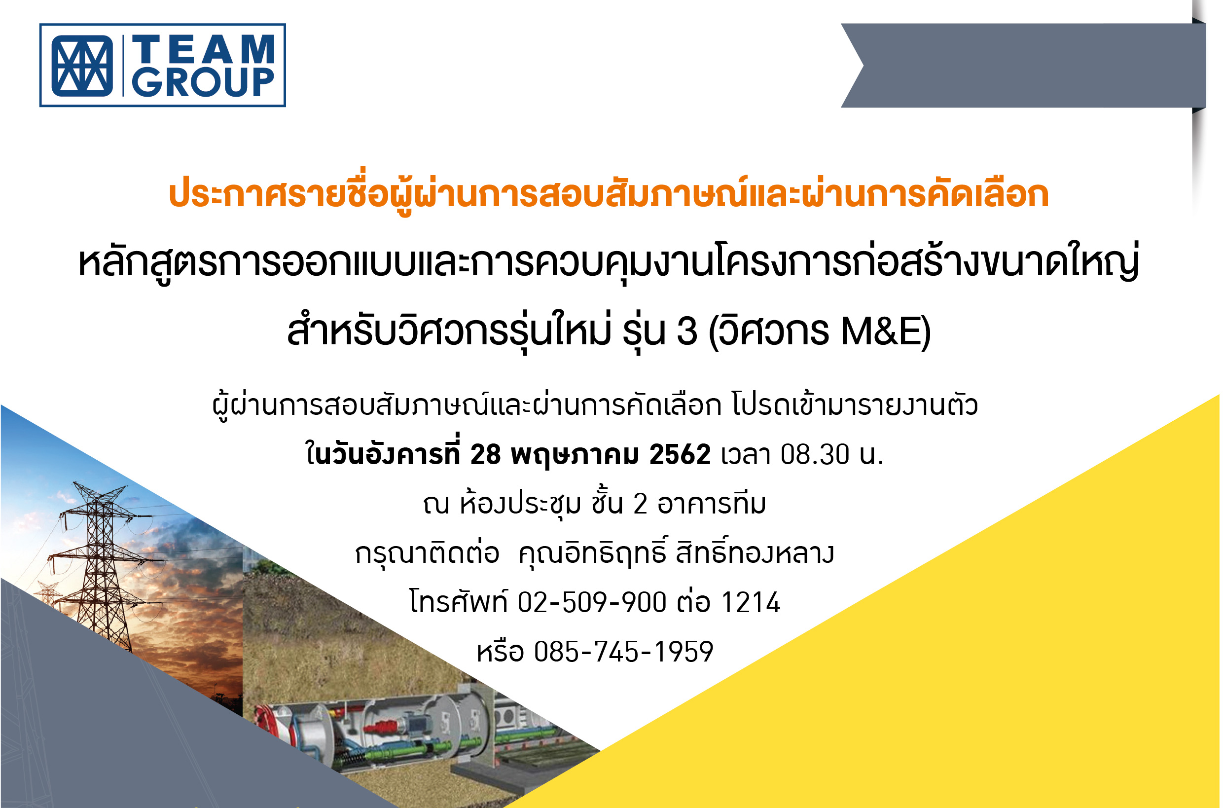 ขณะนี้ การสอบสัมภาษณ์ได้เสร็จสิ้นแล้ว จึงขอประกาศรายชื่อผู้ผ่านการสอบสัมภาษณ์และผ่านการคัดคัดเลือกเพื่อให้เข้าร่วมหลักสูตรการออกแบบและการควบคุมงานโครงการก่อสร้างขนาดใหญ่สำหรับวิศวกรรุ่นใหม่ รุ่น 3 (วิศวกร M&E) โดยมีรายชื่อ (ดังเอกสารแนบ ประกาศรายชื่อผู้ผ่านการสอบสัมภาษณ์และผ่านการคัดเลือก) ทั้งนี้ผู้ผ่านการสอบสัมภาษณ์และผ่านการคัดเลือกตามรายชื่อข้างต้น โปรดเข้ามารายงานตัว ในวันอังคารที่ 28 พฤษภาคม 2562 เวลา 08.30 น. ณ ห้องประชุม ชั้น 2 อาคารทีม ที่ 151 ถนนนวลจันทร์ แขวงนวลจันทร์ เขตบึงกุ่ม กรุงเทพมหานคร กรุณาติดต่อกลับมายัง คุณอิทธิฤทธิ์ สิทธิ์ทองหลางโทรศัพท์ 02-509-900 ต่อ 1214 หรือ 085-745-1959