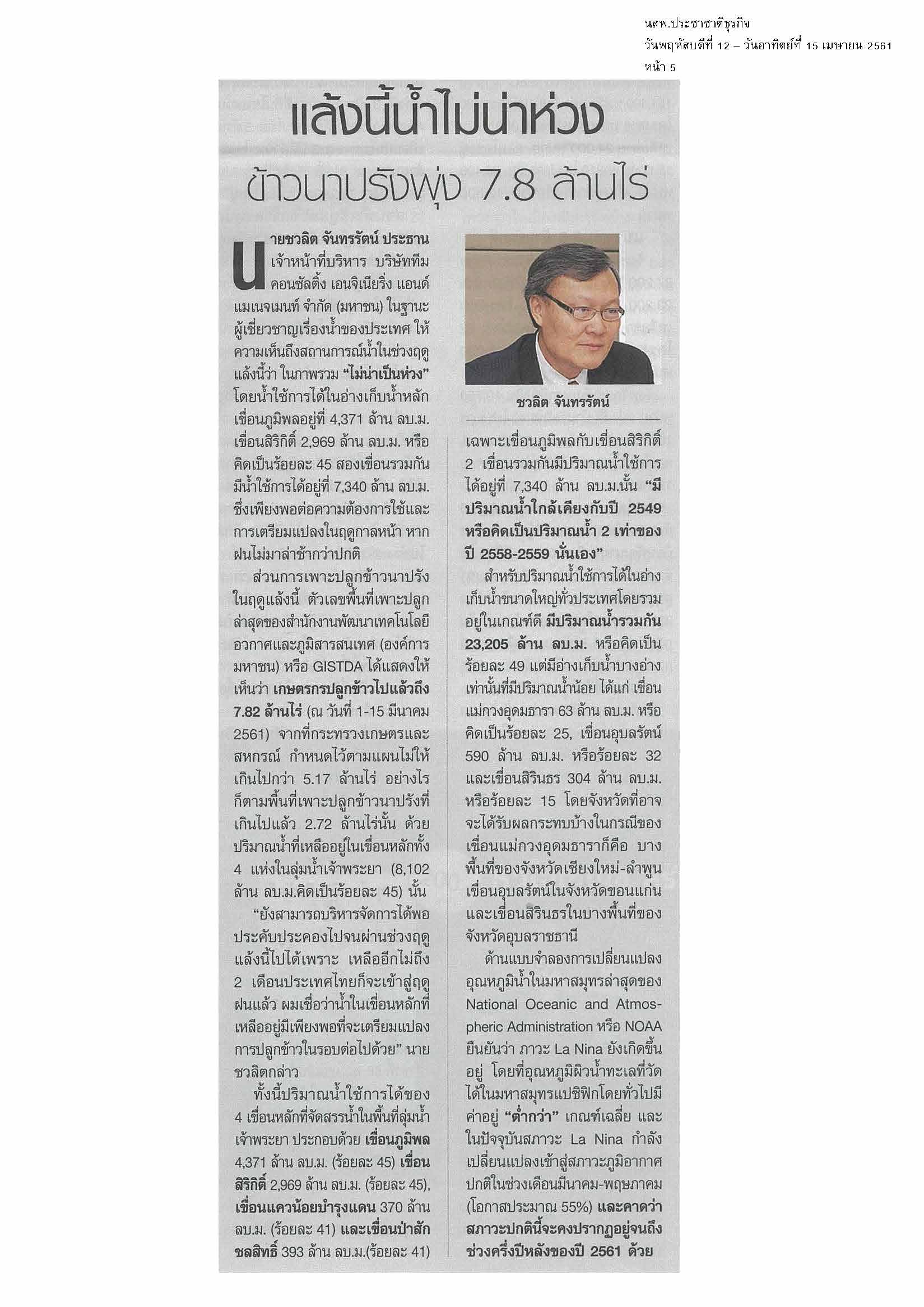 โดย คุณชวลิต จันทรรัตน์ ประธานเจ้าหน้าที่บริหาร บริษัท ทีม คอนซัลติ้ง เอนจิเนียริ่ง แอนด์ แมเนจเมนท์ จำกัด (มหาชน) หรือทีมกรุ๊ป ให้สัมภาษณ์ในประเด็น “แล้งนี้น้ำไม่น่าห่วง ข้าวนาปรังพุ่ง 7.8 ล้านไร่” นสพ.ประชาชาติธุรกิจ ฉบับวันที่ 12 – 15 เมษายน 2561