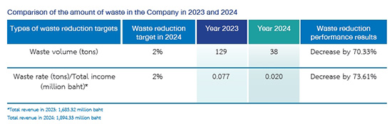 In 2024, the Company’s waste volume decreased by 70.33% from 2023. The intensity of waste volume per income (tons/million baht) decreased from 0.077 in 2023 to 0.020 in 2024, representing a decrease rate of 73.61%. Nevertheless, in 2023, the Company calculated by employing the average waste generation rate, while in 2024, the Company employed the weighting method. However, in 2024, the Company can improve its waste management efficiency in spite of the continuous business growth. The Company’s hazardous waste is small and it is considered insignificant.