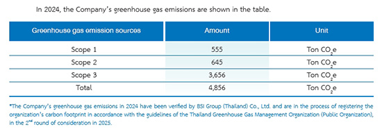 In 2024, the Company has collected data and calculated the amount of greenhouse gas emissions of the organization adopting the carbon footprint assessment guidelines of the Thailand Greenhouse Gas Management Organization (Public Organization), with details as follows: