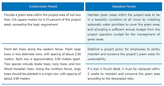 The Company is the construction supervisor and contractor in the project sites. The construction supervision and management unit strictly complies by the policies of environmental impact prevention and reduction as indicated by the relevant regulations. The indicated practices will control the impacts from the air pollution and the waste to the least possible extent. The impacts from the construction include the total suspended particulates (TSP), carbon monoxide (CO), sulfur dioxide (SO2), nitrogen dioxide (NO2), noise pollution, wastewater and solid waste. The construction area and the access road are sprayed with water. The truck tires are washed before leaving the construction site. The machine and equipment are carefully inspected to ensure the normal condition and prevent the noise. The construction hours do not affect the nearby communities. The wastewater in the construction area is treated before discharging. The waste is managed by the 3R system (Reduce, Re-use and Recycle) before disposed by the authorized agencies outside of the project area.