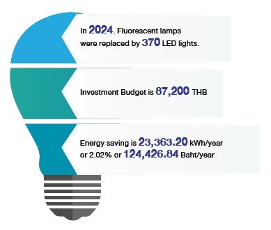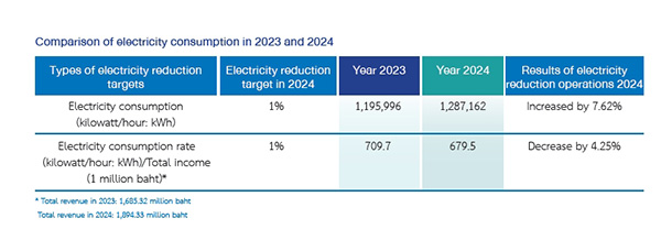 In 2024, the Company’s electricity consumption increased by 7.62% from 2023, due to the increase in the Company’s workload, which is 12.40% increase in revenue growth. The electricity consumption increased by 7.62%, whereas the electricity consumption intensity per income (kWh/million baht) decreased from 709.7 in 2023 to 679.5 in 2024. This shows that even though electricity consumption has increased, the Company has been able to improve its energy efficiency in proportion to the increase in revenue.
