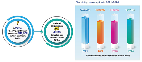 In 2024, the Company’s electricity consumption from the installation of the solar power generation system can be calculated as the greenhouse gas emission reductions in scope 2 or indirect greenhouse gas emissions from electricity use, as follows:
