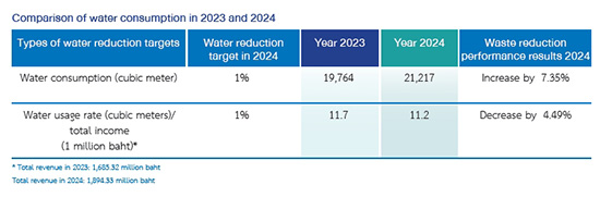 In 2024, the Company’s water consumption increased by 7.35% from 2023, due to the increase in the Company’s workload, which is 12.40% increase in revenue growth from 1,685.32 million baht in 2023 to 1,894.33 million baht in 2024. Although water consumption volume increased, water consumption intensity per revenue (cubic meters/ million baht) decreased from 11.7 in 2023 to 11.2 in 2024. This shows that the Company is able to improve water usage efficiency in comparison to revenue growth.