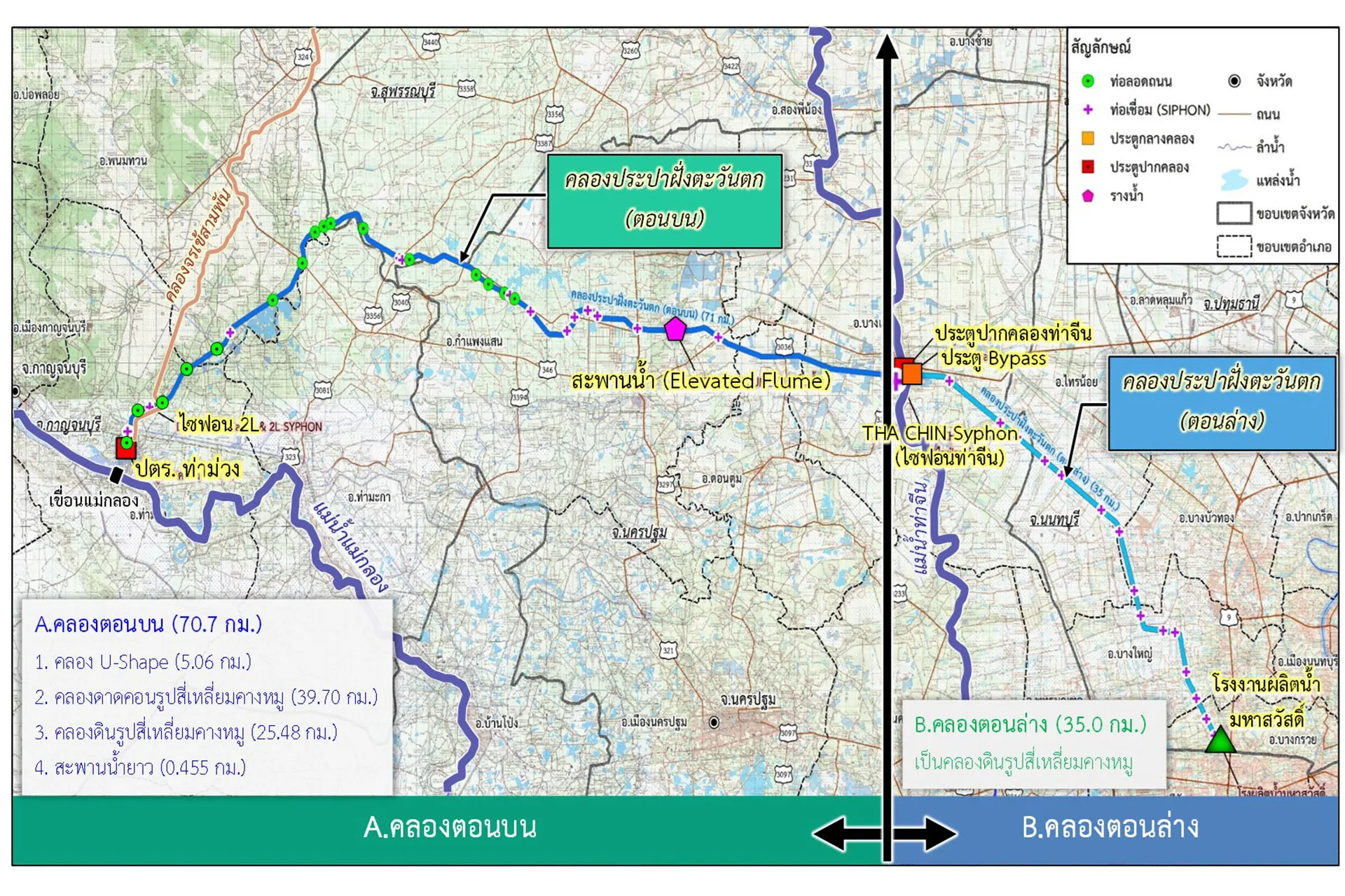 The upper part of Khlong Prapa on the western side (Phase 2: Tha Chin River–Mae Klong Dam). This section consists of a 5.06-kilometer-long U-shaped canal, a 39.70-kilometerlong trapezoidal concrete-lined canal, an earth canal that stretches for 25.48 kilometers to reach the Tha Chin River, and a 455-meterlong elevated flume. It was designed to move raw water at a maximum rate of 45 cubic meters per second. Via gravitation, raw water from Mae Klong Dam flows along 72 kilometers of the upper part of the canal before crossing beneath the Tha Chin River to the upstream retention basin of Bang Len Raw Water Pumping Station.