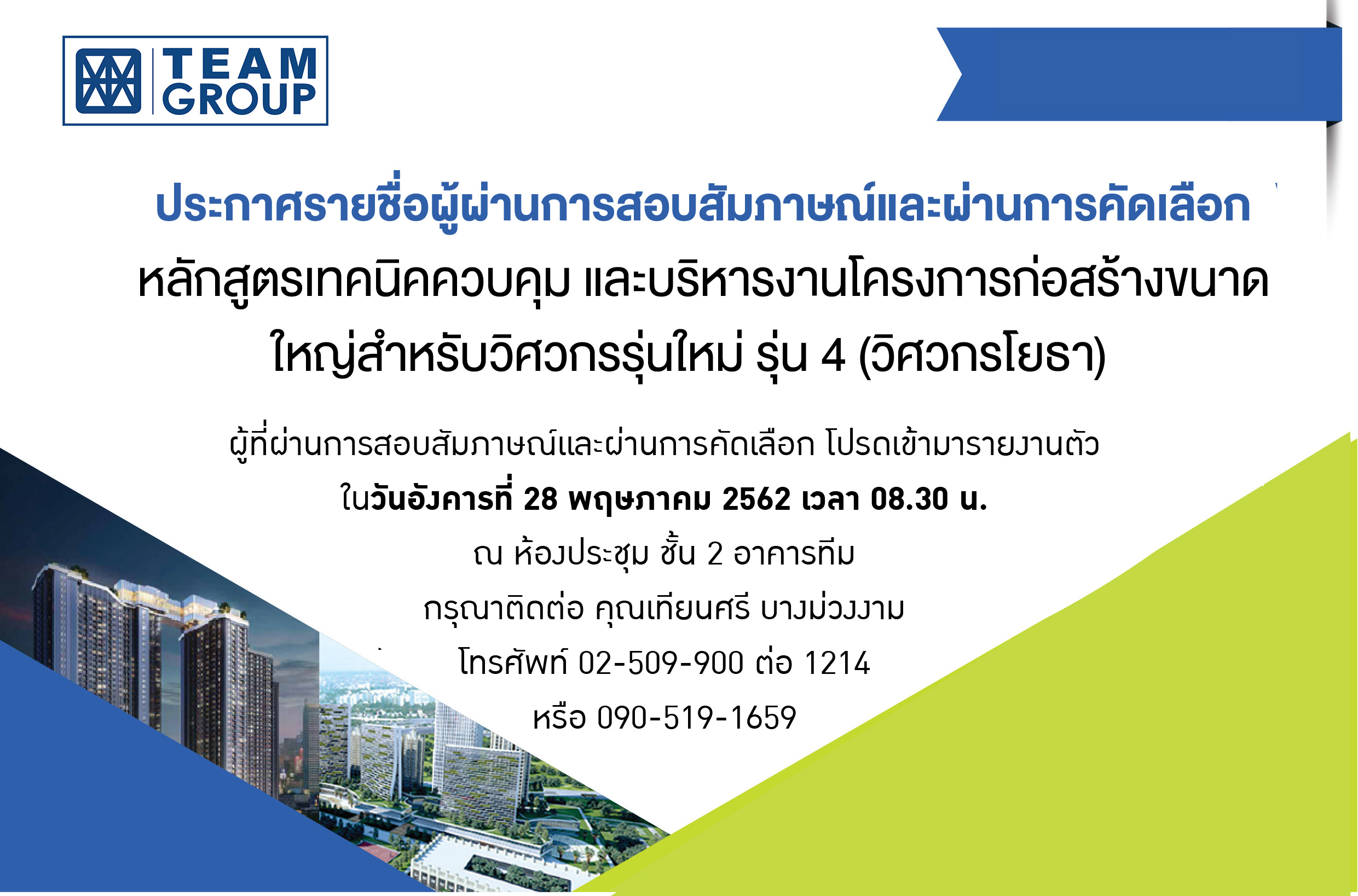 ขณะนี้ การสอบสัมภาษณ์ได้เสร็จสิ้นแล้ว จึงขอประกาศรายชื่อผู้ผ่านการสอบสัมภาษณ์และผ่านการคัดคัดเลือกเพื่อให้เข้าร่วมหลักสูตรเทคนิคควบคุมและบริหารงานโครงการก่อสร้างขนาดใหญ่สำหรับวิศวกรรุ่นใหม่ รุ่น 4 (วิศวกรโยธา) โดยมีรายชื่อ (ดังเอกสารแนบ ประกาศรายชื่อผู้ผ่านการสอบสัมภาษณ์และผ่านการคัดเลือก) ทั้งนี้ผู้ผ่านการสอบสัมภาษณ์และผ่านการคัดเลือกตามรายชื่อข้างต้น โปรดเข้ามารายงานตัว ในวันอังคารที่ 28 พฤษภาคม 2562 เวลา 08.30 น. ณ ห้องประชุม ชั้น 2 อาคารทีม ที่ 151 ถนนนวลจันทร์ แขวงนวลจันทร์ เขตบึงกุ่ม กรุงเทพมหานคร กรุณาติดต่อกลับมายัง คุณเทียนศรี บางม่วงงาม โทรศัพท์ 02-509-900 ต่อ 1214 หรือ 090-519-1659