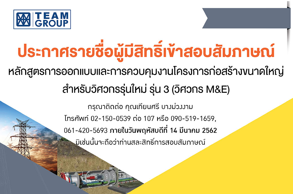 สืบเนื่องจาก หลักสูตรการออกแบบและการควบคุมงานโครงการก่อสร้างขนาดใหญ่สำหรับวิศวกรใหม่ รุ่น 3 (วิศวกรM&E)  ที่ทางบริษัทฯได้เปิดรับสมัครนักศึกษาภาควิชาวิศวกรรมเครื่องกล และ วิศวกรรมไฟฟ้า ที่กำลังจะสำเร็จการศึกษาในปีการศึกษา 2561 และรวมถึงผู้ที่สำเร็จการศึกษามาแล้วไม่เกิน 1 ปี เพื่อมาเข้าร่วมหลักสูตรดังกล่าว และตามที่ผู้สมัครได้ส่งใบสมัครมาเพื่อเข้าร่วมหลักสูตรของทางบริษัท ทั้งนี้ทางบริษัทฯ ได้พิจารณาคัดเลือกผู้มีสิทธิ์เข้าสอบสัมภาษณ์ (ดังเอกสารแนบ ประกาศรายชื่อผู้มีสิทธ์เข้าสอบสัมภาษณ์)