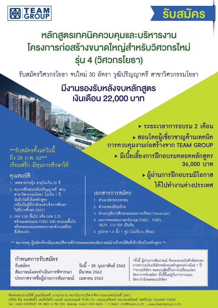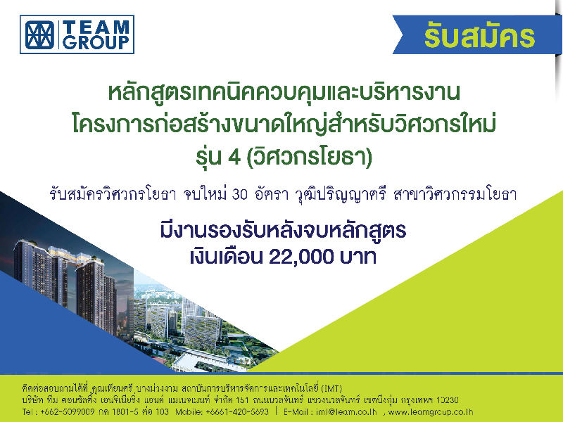 รับสมัครหลักสูตรเทคนิคควบคุม และบริหารงานโครงการก่อสร้างขนาดใหญ่ สำหรับวิศวกรรุ่นใหม่ รุ่น 4 (วิศวกรโยธา)