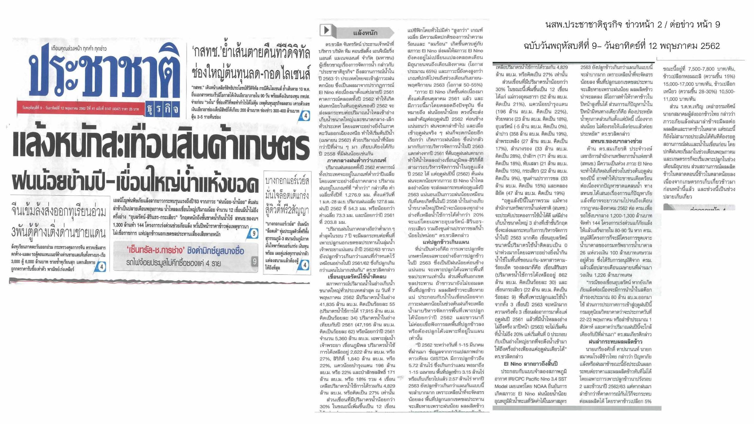 อ่านบทสัมภาษณ์ “แล้งหนักสะเทือนสินค้าเกษตร ฝนน้อยข้ามปี-เขื่อนใหญ่น้ำแห้ง” โดยคุณชวลิต จันทรรัตน์ ประธานเจ้าหน้าที่บริหาร ทีมกรุ๊ป ตีพิมพ์ใน นสพ.ประชาชาติธุรกิจ ฉบับวันที่ 9-12 พฤษภาคม 2562