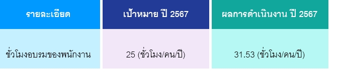 ในปี 2567 บริษัทได้สนับสนุนและส่งเสริมให้พนักงานและผู้บริหารเข้ารับการอบรม อย่างต่อเนื่อง ทั้งจาก หน่วยงานภายในและสถาบันภายนอก ส่งผลให้มีชั่วโมงอบรมเฉลี่ย 31.53 ชั่วโมงต่อคน ซึ่ง สูงกว่าเป้าหมายที่กำหนดไว้ที่ 25 ชั่วโมงต่อคนต่อปี