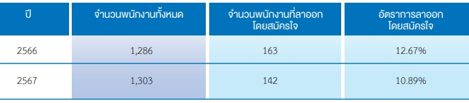ในด้านอัตราการลาออกของพนักงาน ปี 2567 มีพนักงานลาออกโดยสมัครจำนวน 142 คน คิดเป็นอัตราร้อยละ 15.50 ของพนักงานทั้งหมด ลดลงจากปีที่ผ่านมาที่มีอัตราการลาออกที่ร้อยละ 12.67