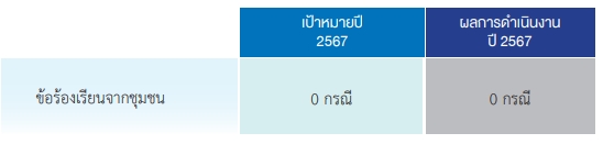 ในปี 2567 ไม่มีข้อร้องเรียนจากชุมชนโดยรอบพื้นที่อาคารทีมและโครงการที่บริษัทไปทำงานในประเด็นด้านสังคมหรือสิ่งแวดล้อม หรือพบข้อร้องเรียนจากชุมชน 0 กรณี ซึ่งเป็นไปตามเป้าหมายที่กำหนดไว้
