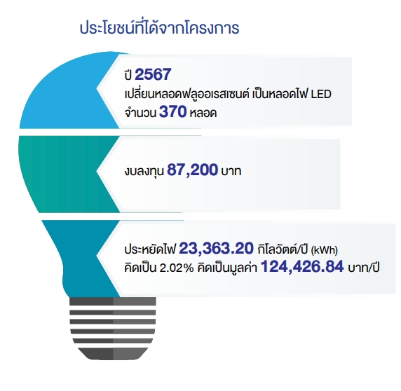 ขอบเขตที่ 2 การใช้พลังงานไฟฟ้าในส่วนของสำนักงาน คิดเป็น 99% ของปริมาณการปล่อยก๊าซเรือนกระจกในขอบเขตที่ 2 โดยบริษัทมีการจัดทำกิจกรรมและรณรงค์ให้พนักงานร่วมกันเป็นส่วนหนึ่งในการประหยัดพลังงานไฟฟ้า เช่น การปิดสวิตช์ไฟเมื่อเลิกใช้งาน/เวลาพักเที่ยง การเปิดเครื่องปรับอากาศในอุณหภูมิ ที่เหมาะสม 25 – 26 องศา และปิดเครื่องปรับอากาศในเวลาพักเที่ยง จำนวน 1 ชั่วโมง
