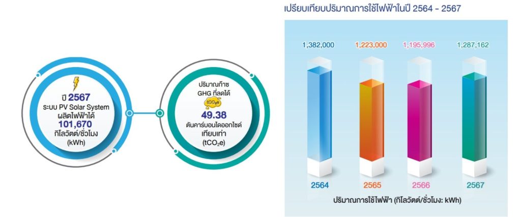 ในปี 2567 บริษัทมีปริมาณการใช้ไฟฟ้าจากการติดตั้งระบบผลิตไฟฟ้าจากแสงอาทิตย์ ซึ่งคำนวณเป็นการลดการปล่อยก๊าซเรือนกระจกในขอบเขตที่ 2 หรือการปล่อยก๊าซเรือนกระจกทางอ้อมจากการใช้พลังงานไฟฟ้าได้ ดังนี้
