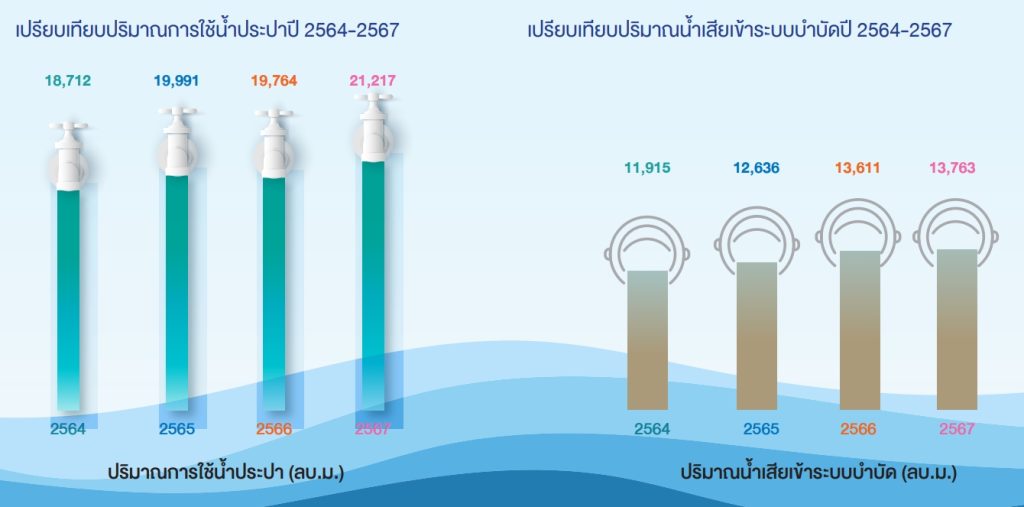 ในปี 2567 บริษัทมีการใช้น้ำเพิ่มขึ้น 7.35% จากปี 2566 เนื่องจากการเติบโตของการดำเนินงานและปริมาณงานที่เพิ่มขึ้น ซึ่งสะท้อนจากรายได้ที่เติบโต 12.40% จาก 1,685.32 ล้านบาทในปี 2566 เป็น 1,894.33 ล้านบาทในปี 2567 แม้ว่าปริมาณการใช้น้ำจะเพิ่มขึ้น แต่ intensity การใช้น้ำต่อรายได้ (ลบ.ม./ล้านบาท) กลับลดลงจาก 11.7 ในปี 2566 มาอยู่ที่ 11.2 ในปี 2567 ซึ่งแสดงให้เห็นว่าบริษัทสามารถปรับปรุงการใช้น้ำให้มีประสิทธิภาพมากขึ้นเมื่อเทียบกับการเติบโตของรายได้