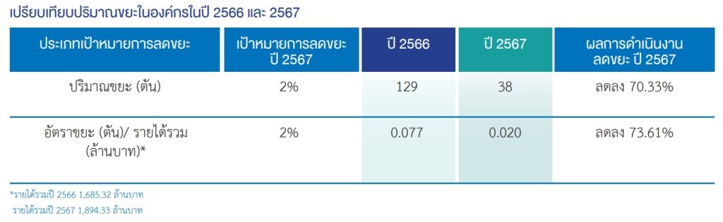 การให้ความรู้และส่งเสริมการมีส่วนร่วมของพนักงาน ในปี 2567 บริษัทได้ดำเนินโครงการแยกขยะพลาสติกและขยะอินทรีย์ (เศษอาหาร) ออกจากกัน โดยให้พนักงานลดการใช้พลาสติกและให้ความรู้กับพนักงานในการทิ้งขยะพลาสติกและขยะอินทรีย์อย่างถูกวิธี โดยแยกถังขยะสำหรับขวดพลาสติกและเศษอาหารโดยเฉพาะ และนำขวดพลาสติกที่แยกไว้ไปบริจาคให้แก่ปั๊มน้ำมัน เพื่อสนับสนุนการรีไซเคิล ลดการนำไปฝังกลบนอกจากนี้ บริษัทได้รณรณค์พนักงานให้ลดการสร้างขยะให้น้อยกว่าหรือเท่ากับ 0.3 กิโลกรัม/คน/วัน อีกด้วย โดยในปี 2567 พนักงานสร้างขยะในอัตราส่วน 0.34 กิโลกรัม/คน/วัน