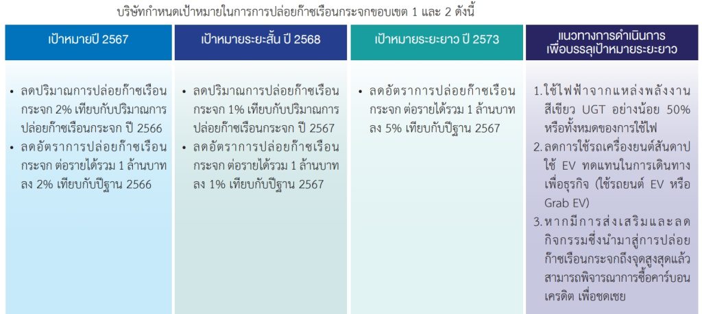*เหตุผลในการกำหนดเป้าการลดการใช้ประเภท 1 และ 2 ในการตั้งเป้าลดการปล่อยก๊าซเรือนกระจก เนื่องจากเป็นขอบเขตที่เกิดขึ้นจากการดำเนินกิจกรรมขององค์กร หรือทางบริษัทมีอำนาจในการควบคุมการปล่อยหรือการดูดกลับก๊าซเรือนกระจก เช่น การเผาไหม้เชื้อเพลิงฟอสซิลแบบเคลื่อนที่ของยานพาหนะขององค์กร การใช้ไฟฟ้า เป็นต้น นอกจากนี้ การปล่อยก๊าซเรือนกระจกประเภท 3 จะเป็นก๊าซเรือนกระจกที่เกิดขึ้นจากการดำเนินกิจกรรมของหน่วยงานภายนอก เช่น คู่ค้า/ผู้ให้บริการ และบริษัทรับเหมา เป็นต้น ทำให้ไม่สามารถควบคุมการปล่อยหรือการดูดกลับ รวมถึงไม่สามารถเข้าถึงข้อมูลปริมาณและแหล่งปล่อยก๊าซเรือนกระจกได้