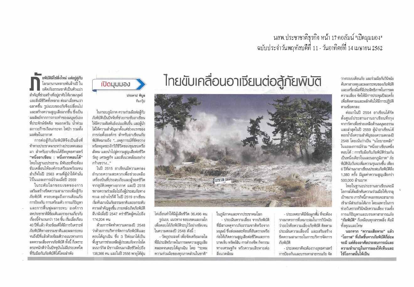 ภัยพิบัติมิใช่สิ่งใหม่ แต่อยู่คู่กับโลกมานานหลายพันล้านปี ในอดีตภัยธรรมชาติเป็นตัวแปรสำคัญที่ช่วยสร้างที่อยู่อาศัยให้มวลมนุษย์และสิ่งมีชีวิตทั้งหลาย อ่าน …ไทยขับเคลื่อนอาเซียนต่อสู้ภัยพิบัติ โดย ประดาป พิบูล ทีมกรุ๊ป ตีพิมพ์ในนสพ.ประชาชาติธุรกิจ ฉบับวันที่ 11–14 มษายน 2562 หน้า 17
